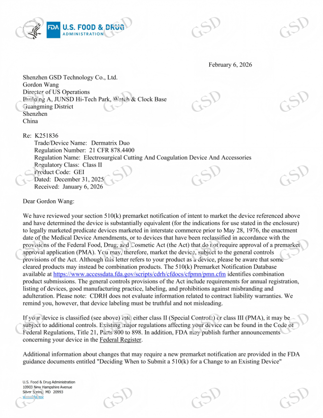 2月6日,由深圳市吉斯迪科技有限公司(以下简称“GSD吉斯迪”)自主研发的射频微针治疗仪(Dermatrix Duo)正式获批美国FDA 510(k)。这是GSD吉斯迪在全球化合规道路上取得的又一重要突破,进一步巩固了其在全球医美设备市场的竞争地位。
