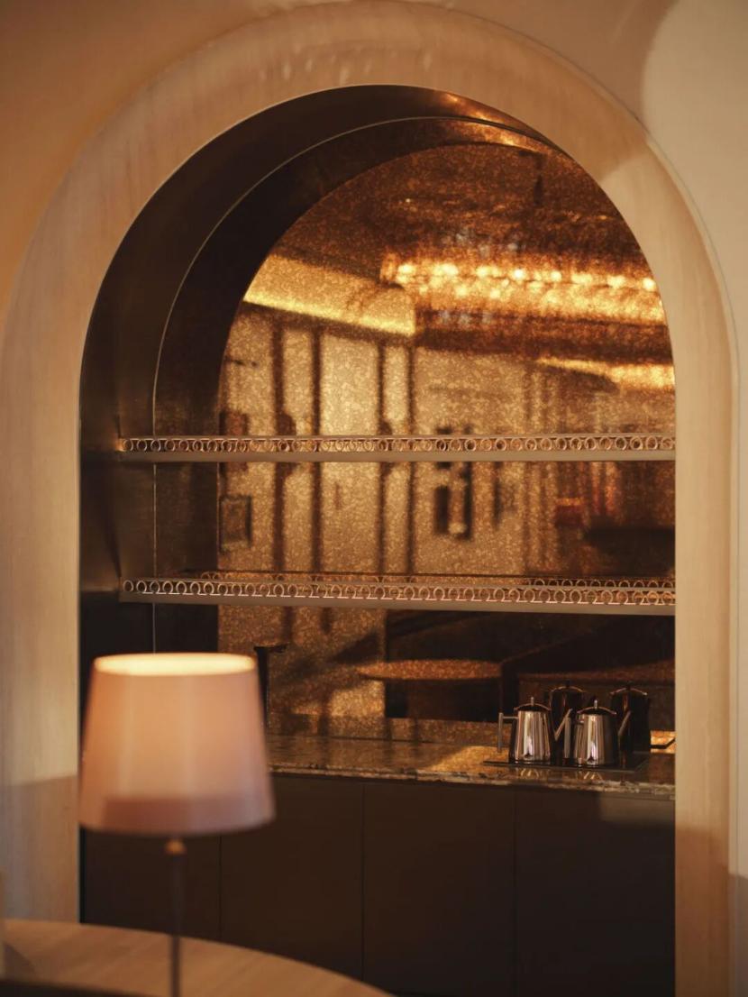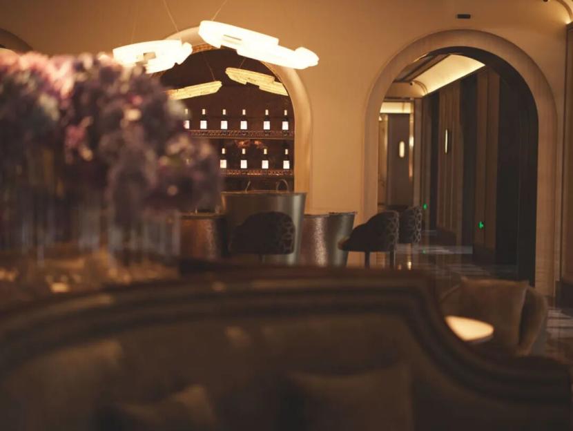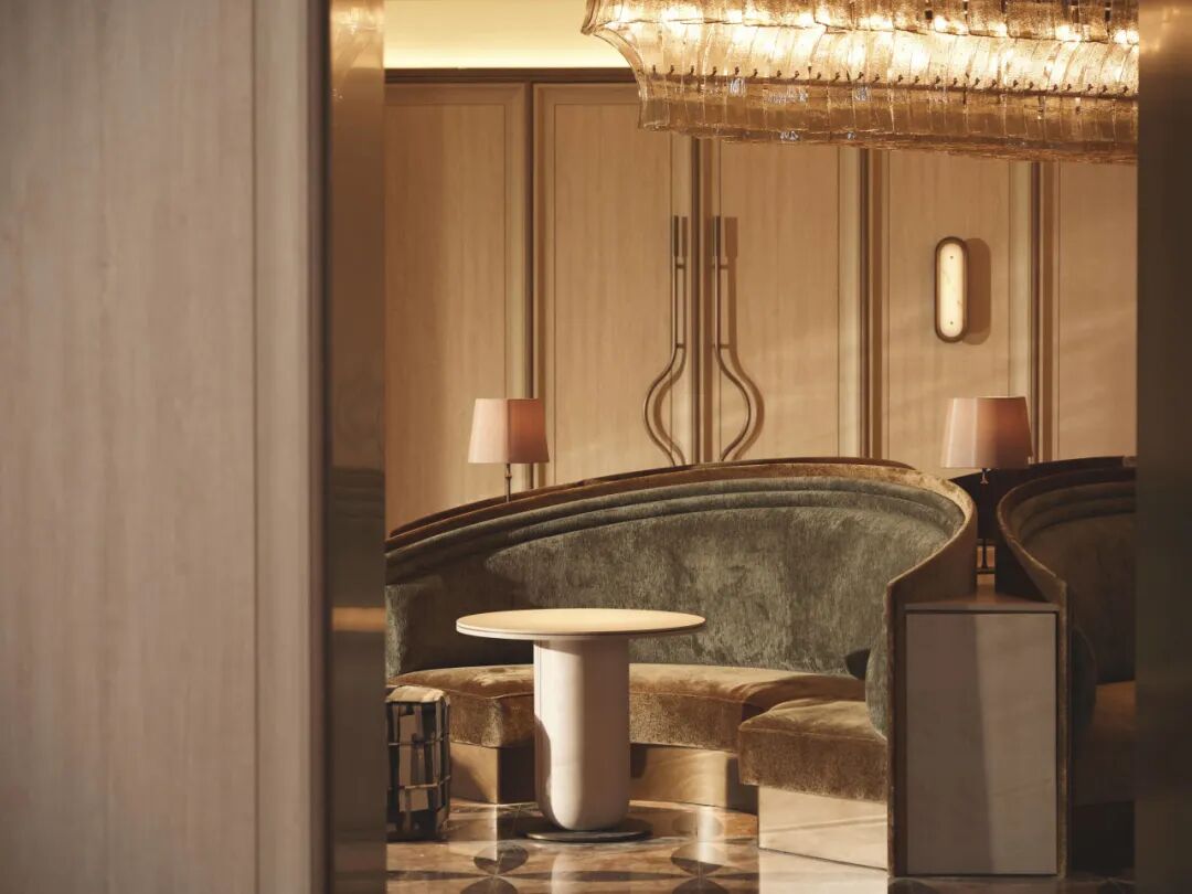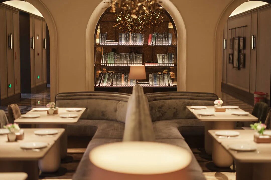 大堂空间一半被设计为阅读区,书架上陈列着精选的法国原版古典书籍;灵感源于巴黎歌剧院的弧形卡座,提供半私密的“安全感”。