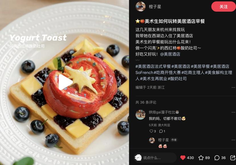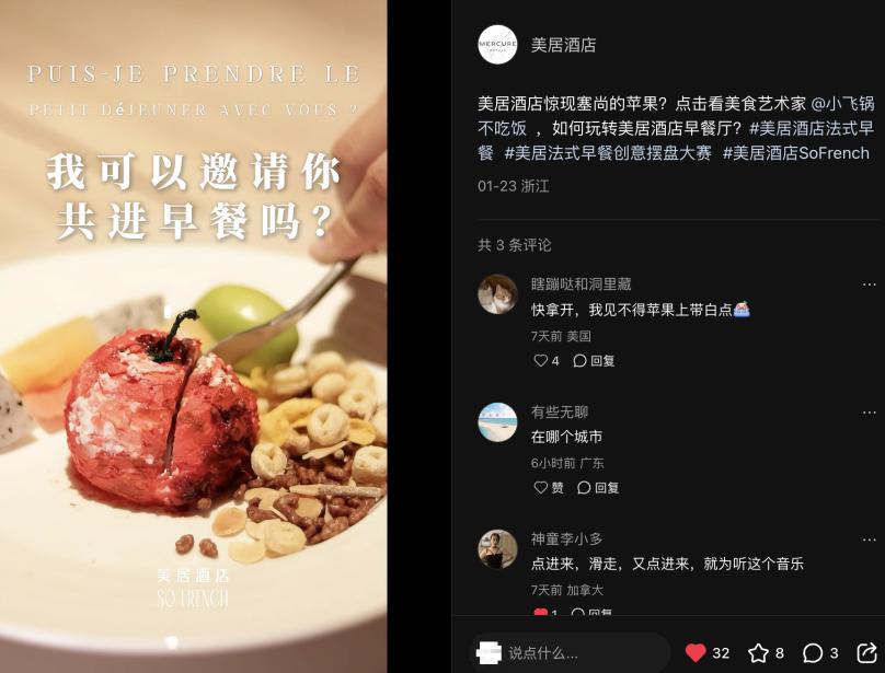只不过,相比起需要提前数月预订、人均消费动辄上千元的米其林餐厅,美居酒店更为讨巧地将早餐体验作为入口,将相似的生活理念渗透进更日常的场景。