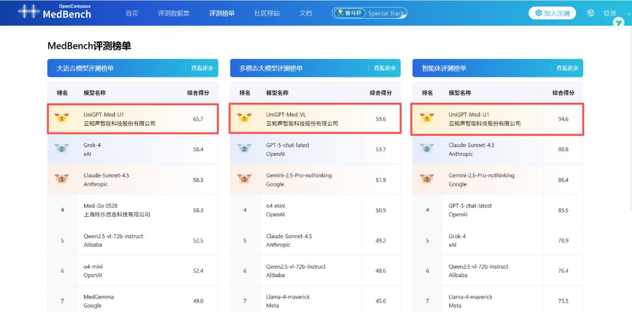 其中,聚焦医疗垂直领域的“山海·知医大模型”展现出惊人的专业能力。在模拟临床执业医师资格考试中,该模型取得523分(满分600分)的高分,大幅超越人类考生365分的平均成绩。在2025年12月发布的MedBench4.0综合评测中,该模型更是以94.6分、65.7分、59.6分的成绩,一举包揽医疗智能体、医疗大语言模型、医疗多模态大模型三项技术范式榜首,荣膺“三冠王”。这种经过国内外权威评测验证的扎实医学知识储备与临床推理能力,为其在高端医疗场景的落地应用奠定了坚实基础。