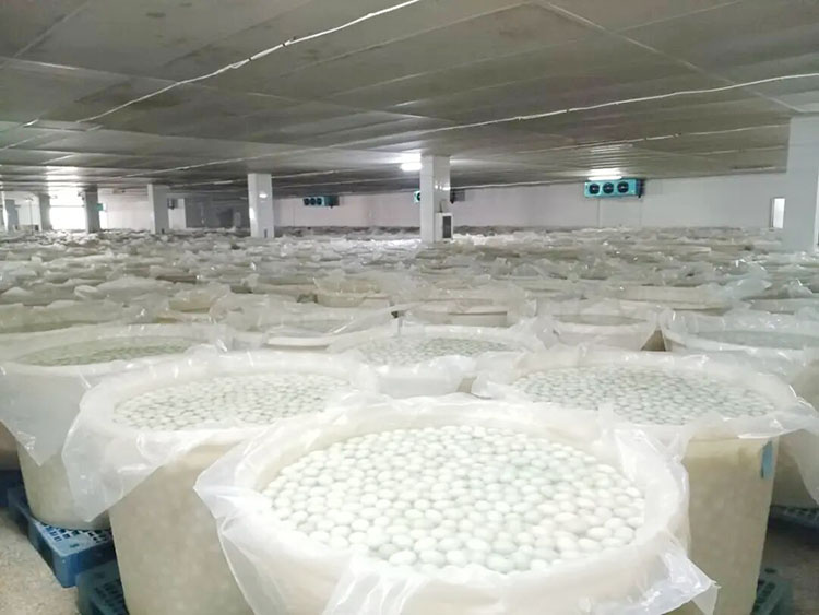 走进该公司皮蛋腌制车间,1300多个直径超一米的大桶整齐排列,每个桶里泡有约5000枚鸭蛋。像这样的车间,该公司有5个,同时腌制着3000多万枚皮蛋。