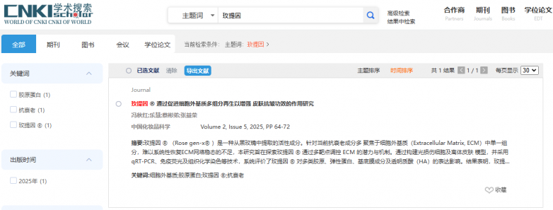 中国知网(CNKI)作为国内规模庞大、资源覆盖面广的综合性学术数字出版与知识服务平台,其收录的文献资源具有极高的权威性和学术价值。此次玫提因®相关研究论文被知网收录,不仅是对梵蜜琳科研成果的权威认可,更是对其在化妆品科学研究领域学术实力的充分肯定。