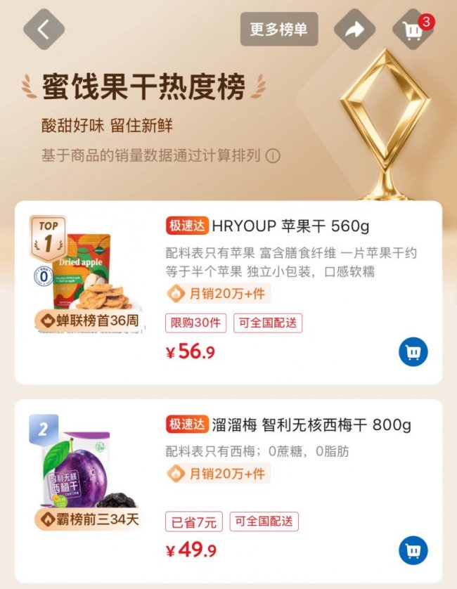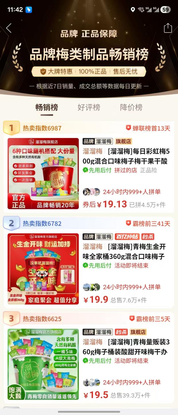 溜溜梅始终坚守「纯净品质」的产品哲学,其智利无核西梅干配料仅含西梅本身,主打零添加,精准契合高端渠道对配料表的严苛要求。该产品长期稳居山姆「蜜饯果干销售榜」第二,不仅收获消费者「闭眼入」的信任,更印证了品牌供应链在应对海量需求时的稳定保障能力。无论线上线下渠道,溜溜梅均保持统一的品质标准,以严苛管控为底层支撑,让品质成为品牌最核心的竞争力。