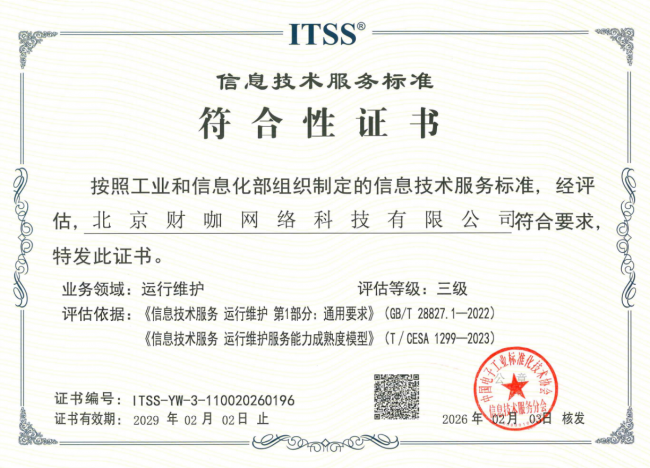 本次通过的ITSS3级认证,是国家针对信息技术服务能力最权威的评估体系。它证明了财咖集团在运维服务的资源配置、流程管控及技术支撑层面,已具备极高的成熟度与可靠性。结合去年12月获得的CMMI3级认证,财咖集团正式形成了“以标准化研发确保产品品质,以规范化运维保障服务价值”的数字治理闭环。