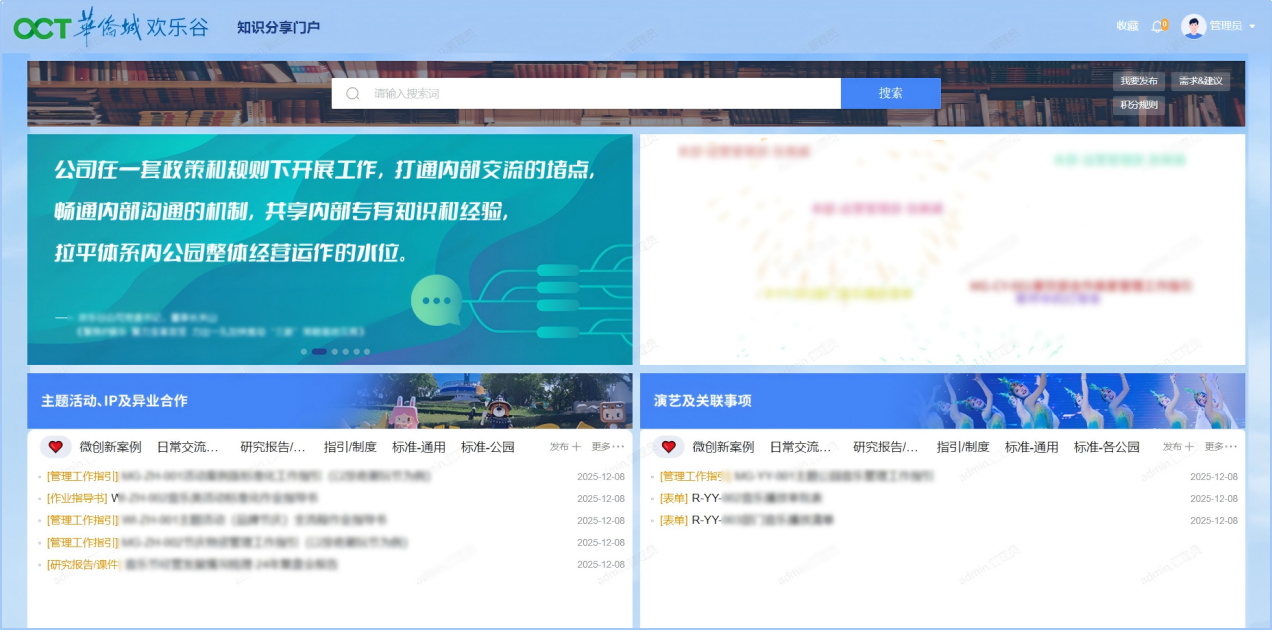一直以来,欢乐谷公司秉持“常看常新、常玩常新”的经营理念,持续推进主题公园产品迭代升级。为激活全体系创新活力,公司推出“微创新行动攻坚项目”,而构建知识分享门户正是其中的重要举措——它不仅助力微创新案例在各园区、各部门间顺畅流转,更承担着汇集沉淀全公司业务知识、打破协作壁垒的重要使命。