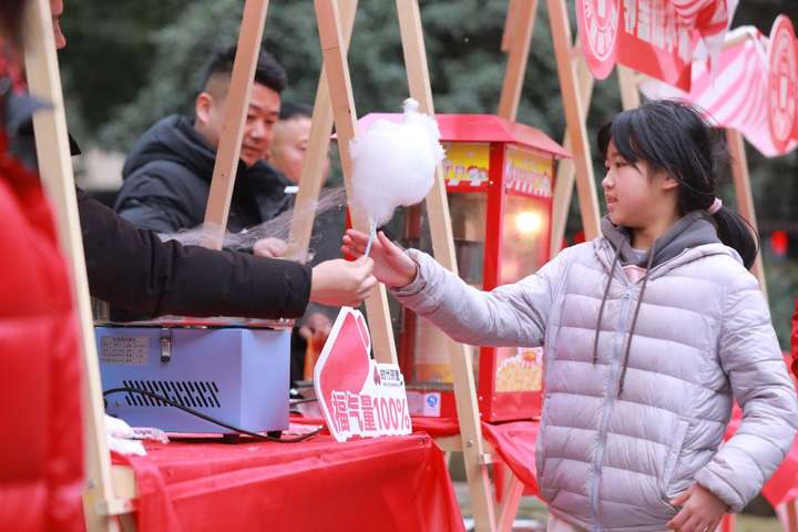 香甜滋润的糖水瞬间驱散冬日寒意,爆米花、棉花糖、糖葫芦免费分发,咔嚓的酥脆与绵密的甜糯交织,盛满了新春的甜蜜与欢喜。
