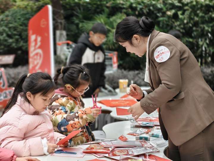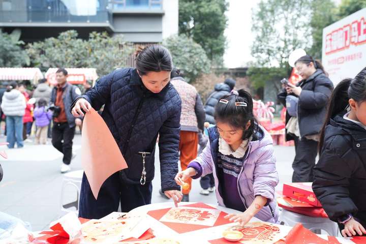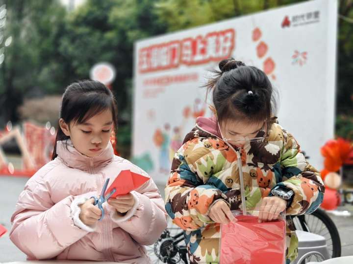 窗花剪纸区热闹非凡,管家现场教学引导,业主们剪出吉祥窗花,让非遗文化在指尖流转。