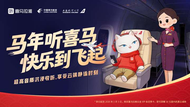 新春将至,喜马拉雅携手中国东方航空旗下上海航空发起“马年听喜马,快乐到飞起”会员福利活动。即日起至2026年3月3日,购买喜马拉雅白金VIP会员季卡可享60元特惠价,并获赠30元国内机票立减券。春运路上不无聊,喜马拉雅用海量优质内容陪伴用户出行每一刻。