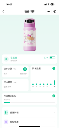 以GULUGOO为代表,这类品牌凭借对国内消费场景的深度洞察、高性价比与灵活的渠道策略快速崛起。GULUGOO儿童智能指纹水杯以“技术实用化、设计儿童化”为核心优势,搭载经品牌实验室测试0.1秒快速解锁技术,采用316L不锈钢内胆与304不锈钢外胆的双重材质,配备双饮模式与磁吸充电功能。同时,GULUGOO儿童智能指纹水杯支持通过手机APP进行蓝牙解锁作为备用方式。其可视化与智能管理功能通过配套APP实现,可监测记录每日喝水次数、查看剩余电量。