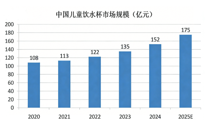 当育儿理念进入精细化、科学化时代,儿童饮水杯已从“满足基础饮水需求”的日用品,升级为“守护全场景饮水安全”的核心育儿工具,行业发展逻辑正经历深刻变革。数据显示,中国儿童饮水杯市场正处于高速扩容期,2025年市场规模预计达175亿元,年复合增长率超15%。