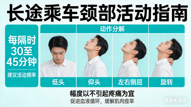 因此,积极的预防远胜于事后处理。长沙南湖医院骨病中心专家团队建议,长途乘车时应将颈部保护意识贯穿始终。出发前,准备一个贴合颈部生理弧度的U型枕或颈枕,能为头部和颈部提供有效支撑,减少颈椎承受的负荷。在旅途中,应有意识地避免长时间维持单一姿势,即使空间有限,也应每隔30至45分钟,尝试缓慢、轻柔地活动颈部,如缓慢地做低头、仰头、左右侧屈及旋转动作,幅度以不引起疼痛为宜,目的是促进血液循环,缓解肌肉痉挛。同时,注意调整座椅靠背角度,使腰背部得到支撑,保持耳、肩、髋大致在同一直线上,减少身体前倾或扭曲。使用电子设备时,尽量举高屏幕,使其与视线平行,避免长时间低头。