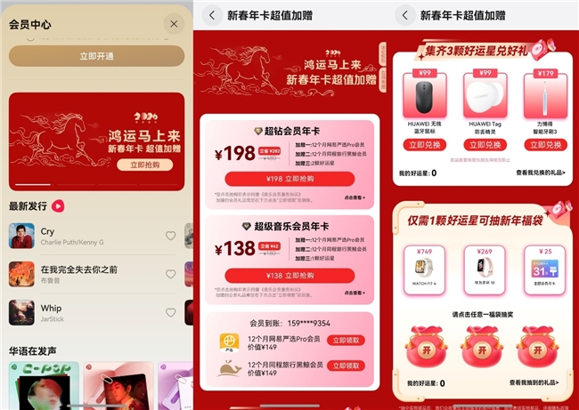 听感体验这么好,福利自然也不能少。大家记得去华为音乐“我的-会员中心”,找到“鸿运马上来-新春年卡 超值加赠”的活动卡片。现在的活动超级划算:198元开通超钻会员年卡,不仅能全年畅享超高清和空间音频等音质权益,还加赠12个月的网易严选Pro会员和同程旅行黑鲸会员,并能领取2颗“好运星”参与兑换或抽奖。