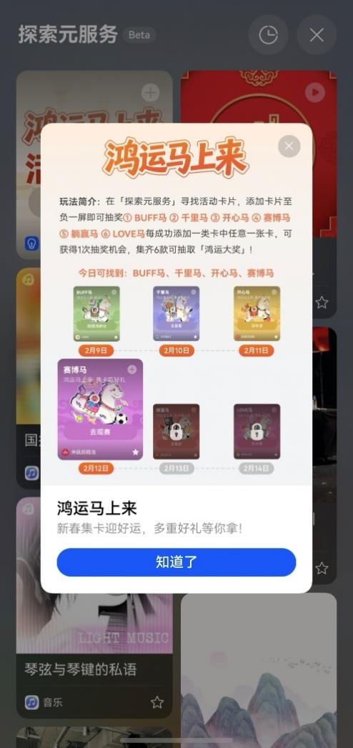 不仅如此,2月9日至14日,用户在华为负一屏底部上滑进入“探索元服务”,添加“鸿运马上来”卡片到负一屏即可参与抽奖。只要成功添加“千里马”卡牌,就有机会抽到闪送优惠券,让新春期间的同城递送省钱更省心。