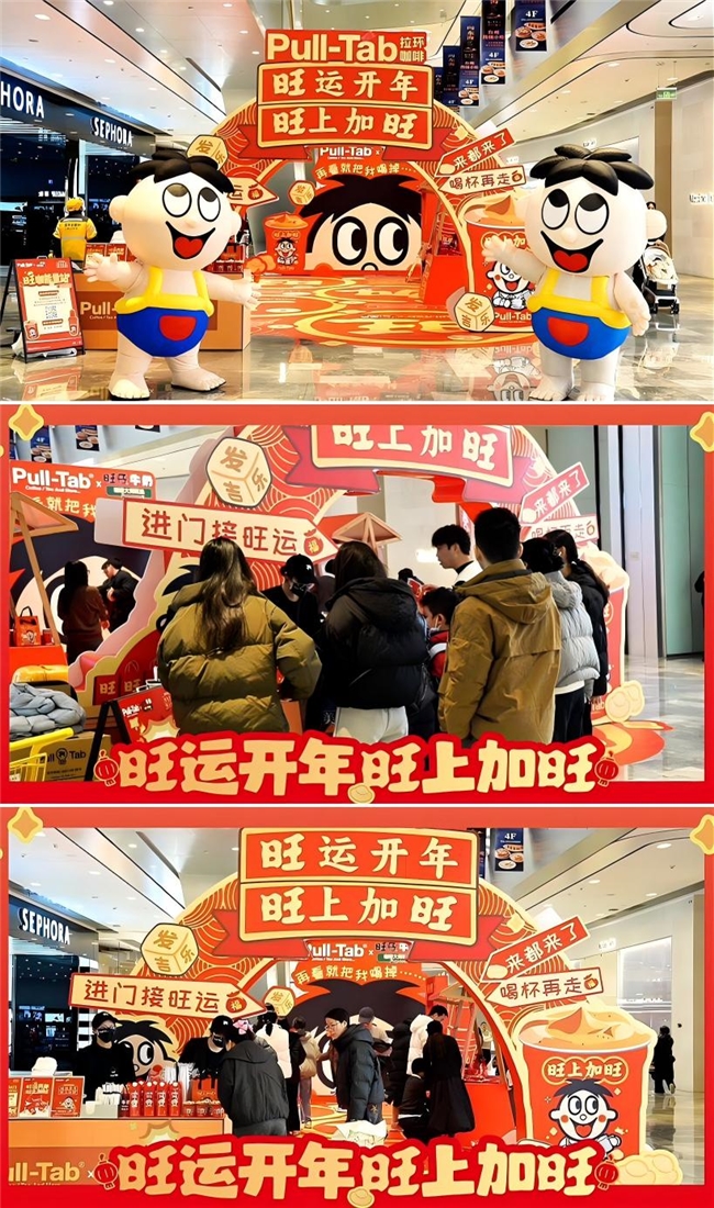 线上热度如火如荼,线下体验同步升温。2月6日-8日,拉环咖啡在杭州来福士中心,打造了为期三天的“旺上加旺”新春主题游园会。