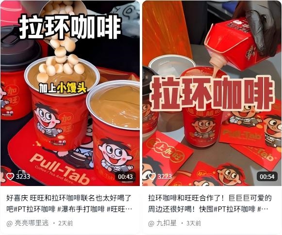 口味创新层面,拉环将其最具标志性的“瀑布咖啡”与旺旺融合,以旺仔牛奶作为基底,推出“旺旺瀑布手打咖啡”,同时在瀑布顶上撒满旺仔小馒头,丰富其饮用口感,收获了一众好评。