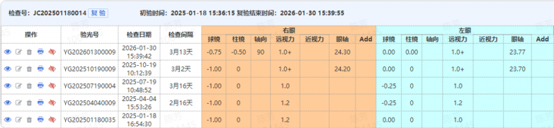 从2025年1月至2026年1月,经过一年的科学干预与持续监测,黄同学的视力控制取得显著成效。最新复查结果显示,其近视度数全程保持稳定,未出现增长;更值得注意的是,通过IOL Master精准检查对比,其右眼眼轴由24.38mm缩短至24.30mm,左眼眼轴由23.95mm缩短至23.77mm,实现了具有临床意义的眼轴减退。