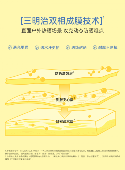 作为户外防晒的升级之作,柳丝木粉胶囊防晒3.0首次应用与江南大学研发团队联合共研的最新独家专利「三明治双相成膜技术」,经多项实测验证,产品实现遇光更强、遇热耐晒、遇水汗更韧、遇摩擦不易掉的硬核防护力表现,即便身处露营、沙漠等暴晒且汗水交加的户外环境,也能稳稳守护肌肤。配方上,粉胶囊3.0采用「7+2物化结合防晒体系」,构筑起SPF50+、PA++++的全波段高倍防护盾,全方位抵御 UVA/UVB 侵害,有效防止晒黑、晒红、光老化等肌肤问题。