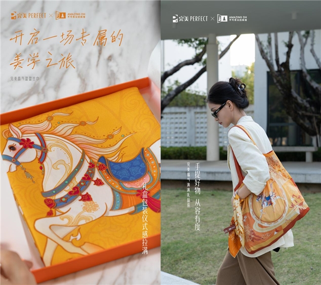 完美中国×不可思议的敦煌:双方围绕“从敦煌中来,到生活中去”这一主题展开深度合作,将敦煌神马、天堑通途等经典艺术元素,进行了在当代生活场景的转译,带来一系列品牌文创产品。