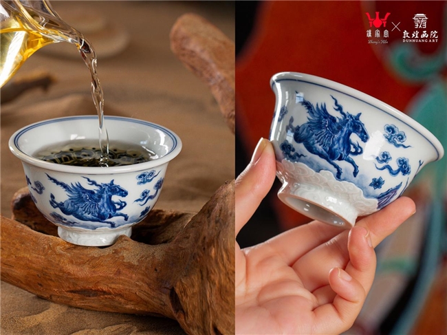 钟家窑×敦煌画院:共同打造了青花浮雕敦煌翼马杯等系列高端陶瓷茶盏,敦煌翼马与祥云等吉祥纹样相映生辉,让千年窑火淬炼出的非遗技艺与敦煌壁画艺术碰撞出收藏级的年礼佳作。