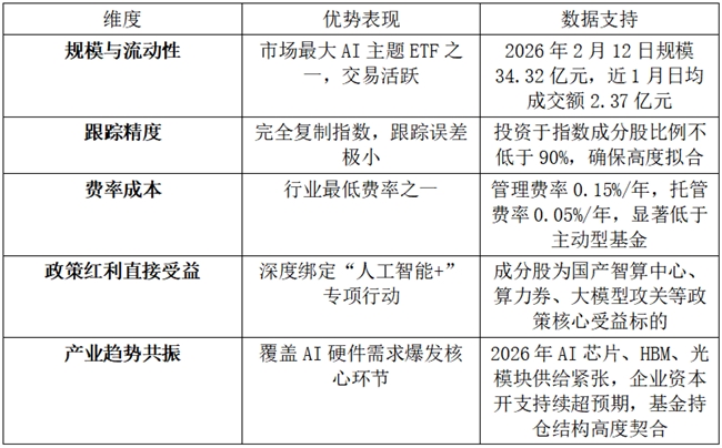 摘要:作为国内首批、规模领先的人工智能主题ETF,平安中证人工智能ETF(512930)自2019年8月23日上市以来,始终紧密跟踪中证人工智能主题指数(930713.CSI),是投资者布局中国AI全产业链的高效、透明、低成本核心工具。截至2026年2月12日,基金最新规模达34.32亿元,近1月日均成交额达2.37亿元,流动性位居同类产品前列,是市场公认的AI产业“风向标”型产品。