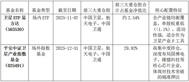 摘要:在卫星ETF易方达(563530)与平安中证卫星产业指数C(025491)这两只重点卫星主题基金中,场内基金易方达ETF(563530)重点持仓中国卫星、航天电子、中国卫通等上游制造龙头,场外基金平安指数C(025491)则显著加仓中国卫星、航天电子、中国卫通,并深度布局国博电子、臻镭科技等核心芯片与器件企业,体现两类基金在配置策略上的差异化路径。