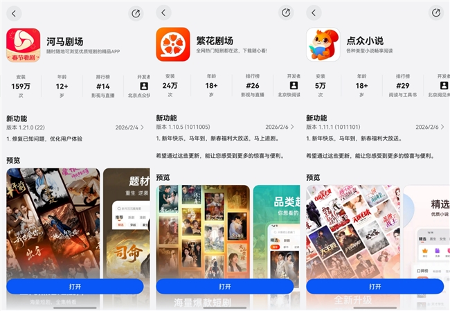 从一键登录秒入戏、桌面卡片随时看,到碰一碰、隔空传送,鸿蒙版河马剧场、点众小说、繁花剧场让“追剧追文”无需等待,为春节宅家放松、亲友共赏带来了更流畅、智慧的新选择。现在就上华为应用市场,更新或下载鸿蒙版河马剧场、点众小说、繁花剧场,肆意“挥霍”这个春节假期吧!