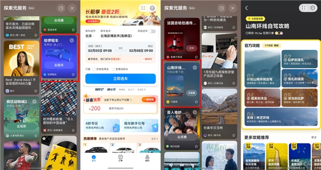 春节自驾返乡或周边游,哈啰租车、马蜂窝、捷停车等实用卡片会提前出现在负一屏。点一下就能快速预订车辆,还能查看热门自驾路线攻略;路上需要加油时,附近的加油优惠卡片适时弹出,免下车享优惠;抵达目的地后,“捷停车”自动匹配附近停车点,离场时车牌识别自动扣费,全程无需额外操作。在你需要“赶路”的时候,探索元服务替你省下“操心”。