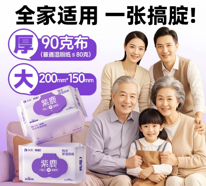紫鹿厚湿厕纸的“厚”,首先提供了一种物理层面的“确定性”。90g/㎡基布带来的扎实手感与强韧特性,在擦拭前就通过触觉传递出“可靠、不会破”的明确信息。这种在行动发生前就能确认的“质量保证”,有效缓解了因产品单薄而产生的、对清洁过程可能中断或失效的潜在担忧。它相当于为用户提供了一个可依赖的、不会出错的“工具”,这种确定性本身就是一种高级的情绪价值。