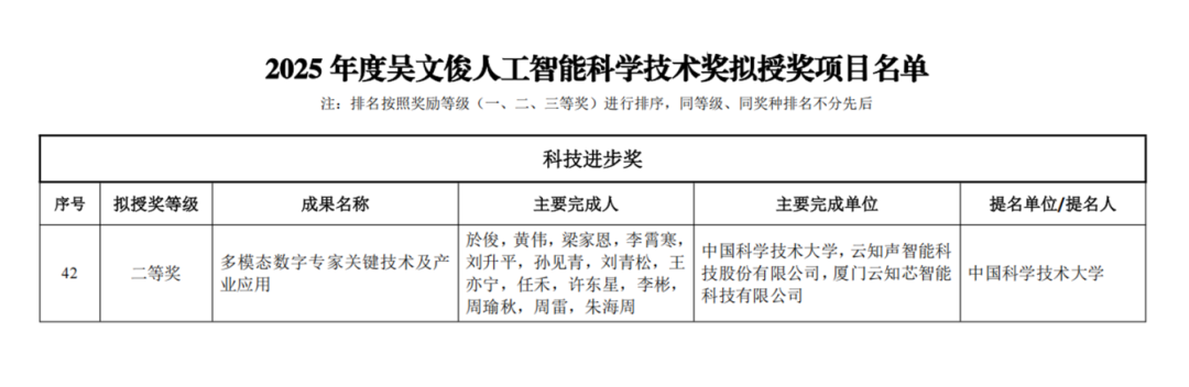 近日,素有“中国智能科学技术最高奖”之称的吴文俊人工智能科学技术奖2025年度获奖名单正式揭晓。云知声与中国科技大学组建的联合团队凭借原创性成果“多模态数字专家关键技术及产业应用”项目斩获科技进步奖二等奖,这是云知声继2019年首次摘得该奖项后再度登榜,成为业内为数不多两次斩获这一人工智能顶级荣誉的企业,硬核实力再度获得权威认可。