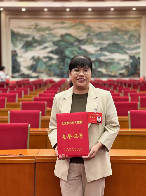 图为2024年芦溪特殊学校校长刘小清在北京领取全国教书育人楷模荣誉证书
