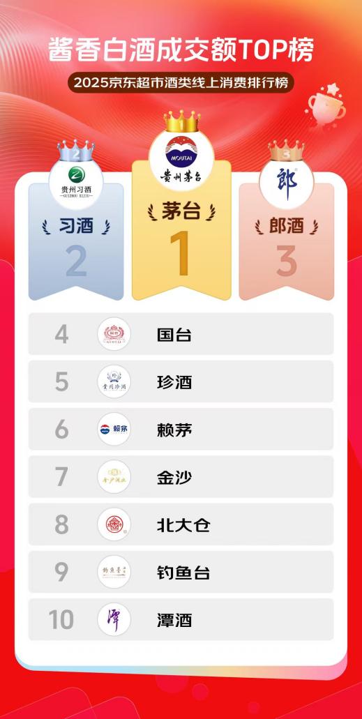 近日,京东超市2025年度酱香白酒成交额出炉。榜单显示,在竞争激烈的酱香型白酒市场中,茅台、习酒、郎酒等传统头部品牌依然领跑,同时,地方特色酒类品牌也深受消费者喜爱。