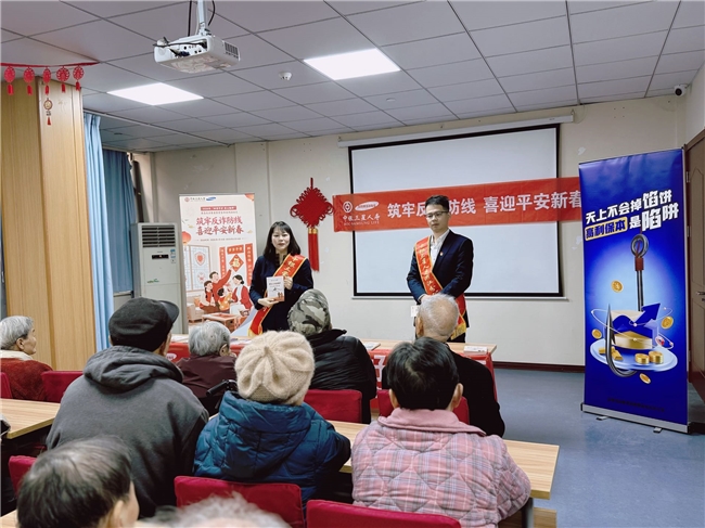2026年2月12日上午,在新春佳节来临之际,中银三星人寿浙江分公司组织业务服务部与风险合规部前往杭州市上城区瑞和颐养中心联合开展“筑牢反诈防线,喜迎平安新春”金融知识主题宣教活动,为老年群体送上金融安全知识与暖心新春祝福。