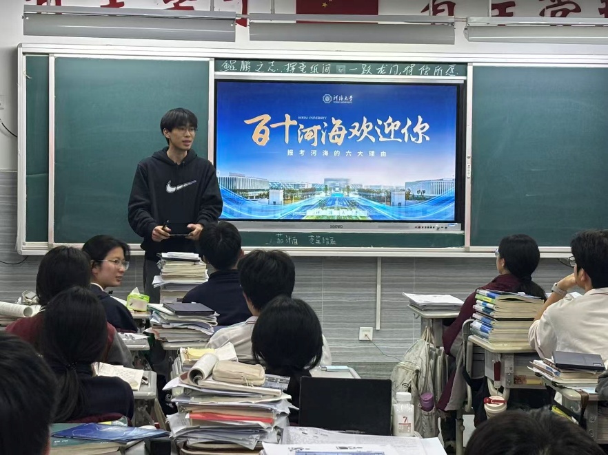 随后,团队成员走进班级开展集中宣讲。伴随着河海大学招生宣传片的播放,课堂气氛逐渐升温。宣讲中,队员们借助PPT系统介绍了河海大学的发展历程、学科优势与校园生活,重点分享了学校在水利、信息与工科等领域的特色成果,并结合自身经历讲述真实的大学学习与生活体验。