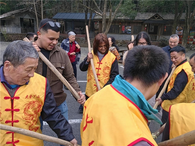 外国游客江西赣州大余丫山景区体验打黄元米果等当地非遗文化