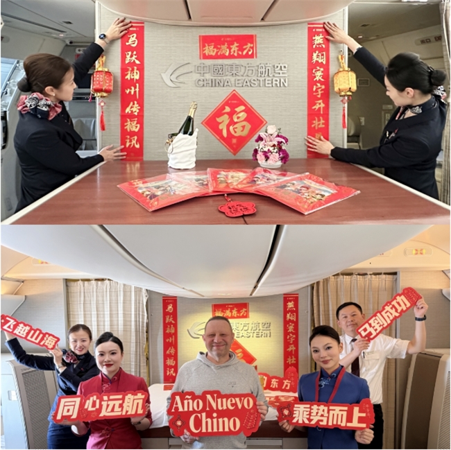当天航班的客舱内,精美的对联、多彩的灯笼、喜庆的福字、定制版东航福袋营造出空中的年味,传递中国传统节日的喜庆与温暖。特别推出的新春特色餐食,为旅客送上舌尖上的年味,将马年春节的殷殷年味铺上万米云端。