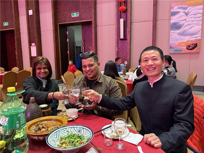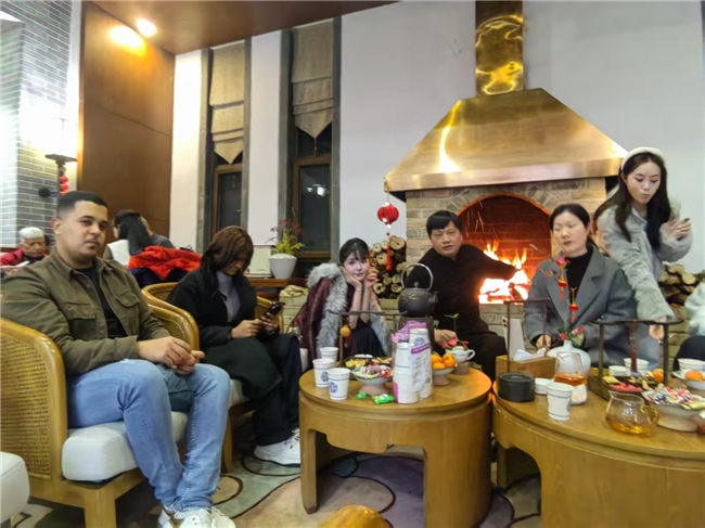 来自加拿大的李博、摩洛哥的穆尼尔和斯里兰卡的唐星菲等外国游客与曾担任央视和湖南卫视春晚顾问的我国著名青年作家、导演、文旅专家、文化批评家张一一以及《渴望》《北京人在纽约》制片人李全福,著名篆刻家、故宫博物院特约篆刻师黄河、世界古武术学会总教练王仕品、获邀2026央视马年春晚的《我的母亲》作者安三山、首届“农民艺术奖”得主罗名华、网红主播“天降小雨”“和你莓完”等中国社会各界人士打黄元米果、手工制作牛角酥、油糍、茶叶蛋等新年民俗小吃、吃年夜饭并一起“看春晚,聊春晚,点评春晚”,过了一个非常有意义且难忘的中国年,表示“明年我们还想带更多朋友来过中国年!”