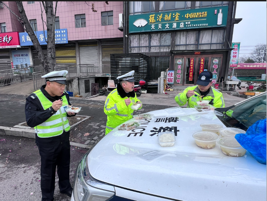 G206线与G318线交叉口春节期间交通流量大、易拥堵,是安庆的北大门,正月初一,怀宁公安交管执勤的民警利用午间平峰时吃午餐。