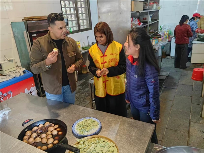 近日,来自摩洛哥的穆尼尔、斯里兰卡的唐星菲(中文译名)、加拿大的李博等外国游客与我国著名青年作家、导演、文旅专家张一一以及《渴望》《北京人在纽约》制片人李全福,故宫博物院篆刻家黄河、世界古武术学会总教练王仕品、获邀2026央视马年春晚的《我的母亲》作者、第12届“农民文学奖”得主安三山以及首届“农民艺术奖”得主罗名华等社会各界知名人士和知名网红“和你莓完”“天降小雨”一起参与了打黄元米果、手工制作牛角酥、油糍、茶叶蛋,一起看春晚、聊春晚,学习中国武术、篆刻、围棋文化,还挑战“马年让马”、“一字千金”修改《马赋》等文化活动,乐不思归,表示“中国年很有意思,我们太爱中国了,明年我们希望会有更多的家人和朋友来中国过年!”