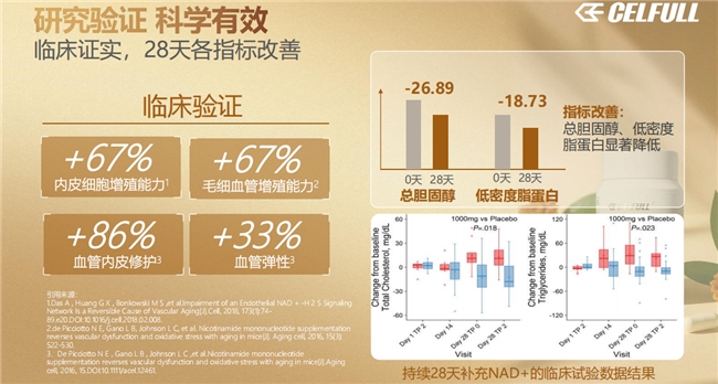 赛立复血管黄金PLUS的效果经多中心随机对照试验验证(1000mg剂量组vs安慰剂组),28天核心指标改善显著(P值均<0.05):血管内皮修护能力提升86%,内皮细胞与毛细血管增殖率均提升67%;总胆固醇降低26.89%,低密度脂蛋白降低18.73%;血管弹性提升33%,有效改善血管僵硬。真实用户反馈:“63岁父亲服用28天,血压调整到健康水平”“血脂异常从4个箭头减到2个,胸闷头晕消失”,用实际效果印证临床数据。