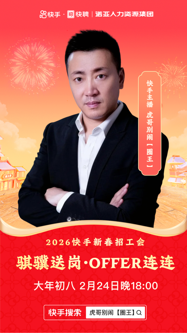 春节的热闹还未散去,开工的号角已经吹响。2月24日(大年初八),诺亚人力携手快手快聘,特邀百万网红“圈王”虎哥别闹做客直播间,开启“骐骥送岗OFFER连连”2026新春招工会,为求职者送上一份超“硬核”的开工大礼。