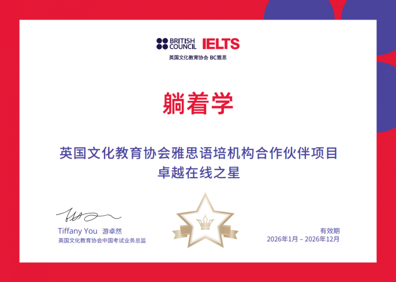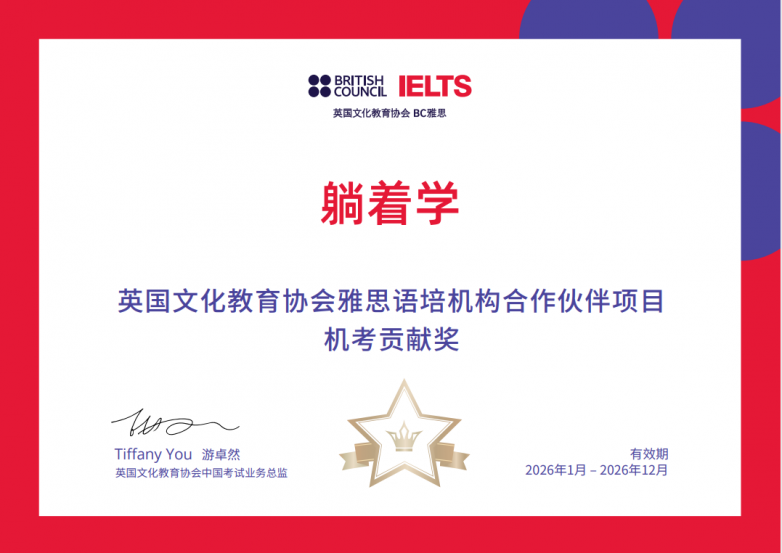 三项殊荣同期加冕,这是英国文化教育协会(British Council)对躺着学雅思专业能力、服务质量与创新实践的最高级别认证。