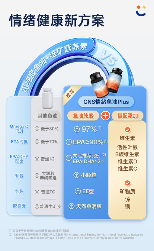 在高压时代,情绪健康的维护需要科学、温和的方式,营养干预作为重要的辅助手段,其价值正被越来越多的人认可。cns情绪鱼油将活性叶酸与多种营养素协同,这种基于科学实证的配方思路,既体现了对情绪健康的关注,也传递了理性的健康管理理念,助力人们在高压环境下更好地呵护自身情绪,以更平和的心态应对工作生活的各种挑战。