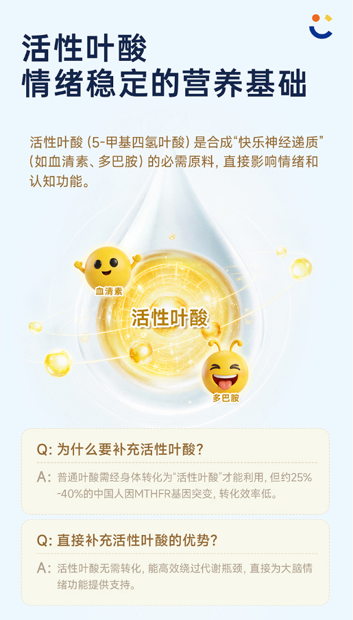 需要注意的是,普通叶酸进入人体后需经过代谢转化才能被吸收利用,但部分人群存在MTHFR基因突变,导致普通叶酸的转化效率大幅下降,即便补充足量普通叶酸,仍可能出现功能性缺乏。而活性叶酸作为普通叶酸的天然活性形式,无需复杂代谢即可直接被人体吸收利用,绕过了基因差异带来的吸收局限,能更精准地为神经递质合成提供支持。所以,对于高压人群而言,针对性补充活性叶酸,可为情绪健康搭建基础的营养支撑。