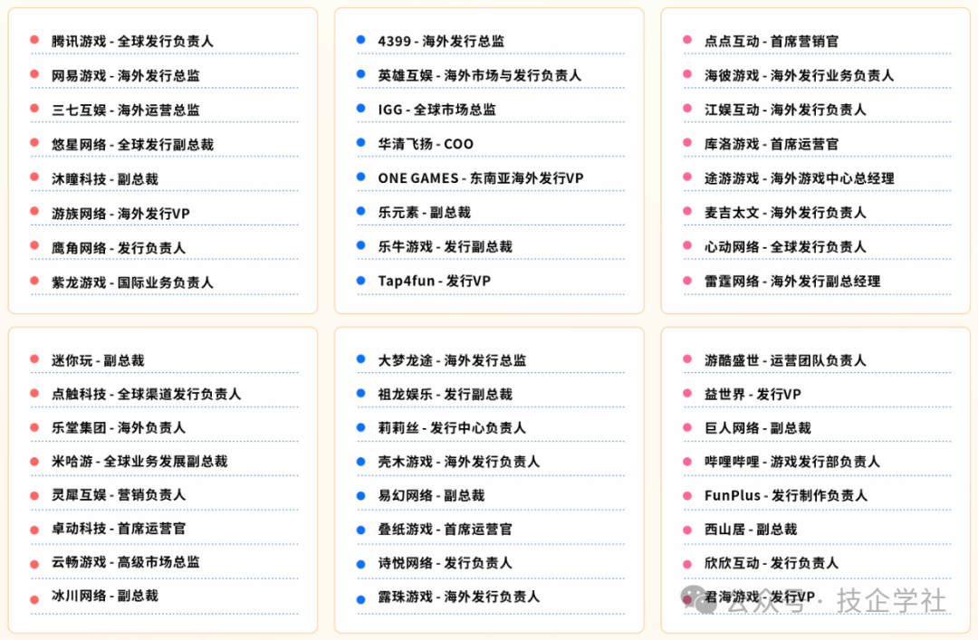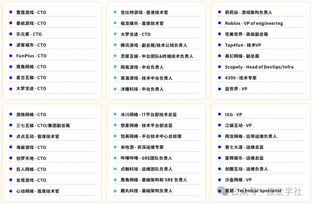 35+分享嘉宾来自全球头部游戏公司及领先技术企业,均为关键业务的一线首席专家,经过大型项目验证的实战经验、架构设计与增长模型,确保每一个洞察都具备高度的可操作性与借鉴价值。