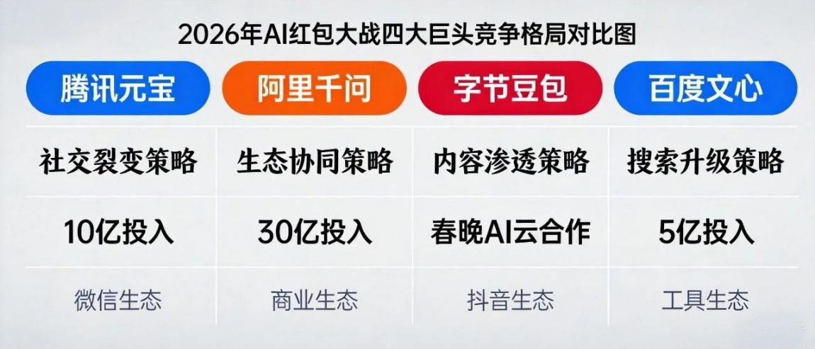 2026年春节前,互联网大厂的AI竞争演化为一场总额超过45亿的补贴盛宴,但其中两条路径的对比尤为鲜明:腾讯元宝豪掷10亿现金红包,依靠其微信社交链的互动分享期待融入AI消费浪潮中;而阿里千问则投入30多亿,以“AI对话中0.01元请喝奶茶”的活动,将用户引向一个由AI驱动的即时零售世界。