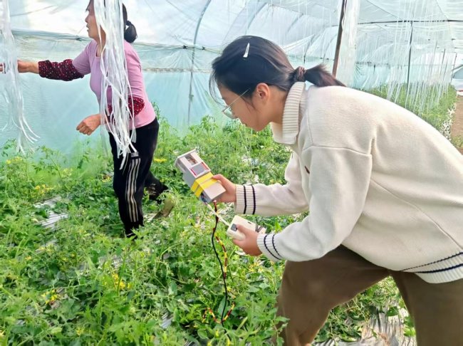 图为实践团在番茄大棚内使用一体式检测装置检测环境数据。李诗韵 供图
