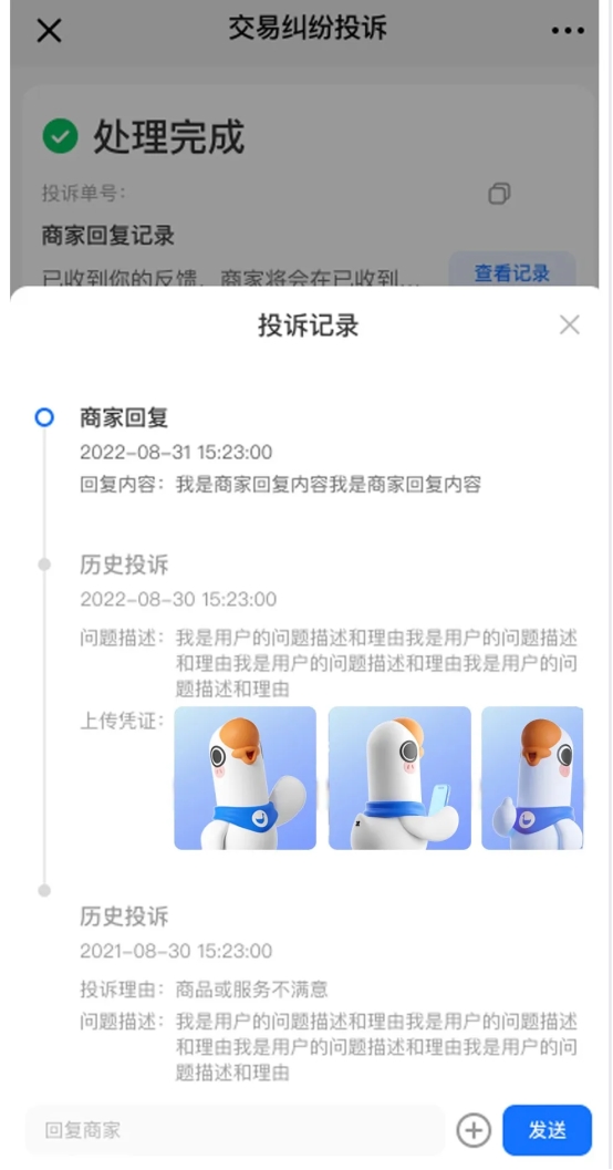 此前商家处理交易投诉时,存在跨渠道投诉界面不统一、处理后无法补充凭证、同一订单易被用户重复发起投诉,且用户无法直接回复商家的问题,无效投诉占比高,商家处理负担重。