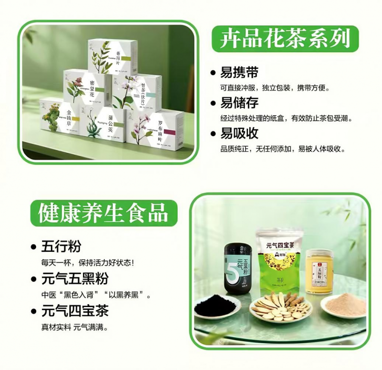 有日常饮茶这类轻养生习惯的人群,可以选择鸿翔中药“卉品花茶系列”与“健康养生食品系列”。“卉品花茶”采用独立包装,便于携带与储存,纯净无添加,在工作间歇冲泡一杯,即可舒缓情绪、清新身心;“五行粉”“元气五黑粉”“元气四宝茶”等食养产品,则将中医养生理念融入便捷的冲调形式,每日轻松饮用,帮助身体在温和滋养中逐步恢复平衡、唤醒活力。