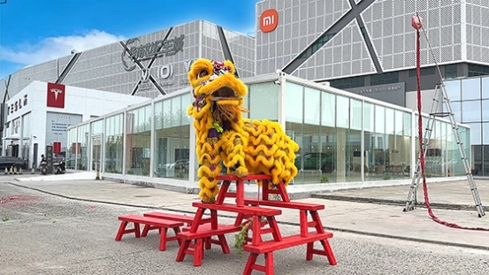 喜庆的氛围从运营中心蔓延至车城门口,高达数米的高杆矗立当场,杆顶悬挂着生菜、红包,醒狮迎难而上,凭借矫健身姿攀爬至杆顶,成功完成 “高杆采天青” 的高难度动作,咬下悬挂的生菜与红包,象征马年 “独占鳌头、天送财运”。