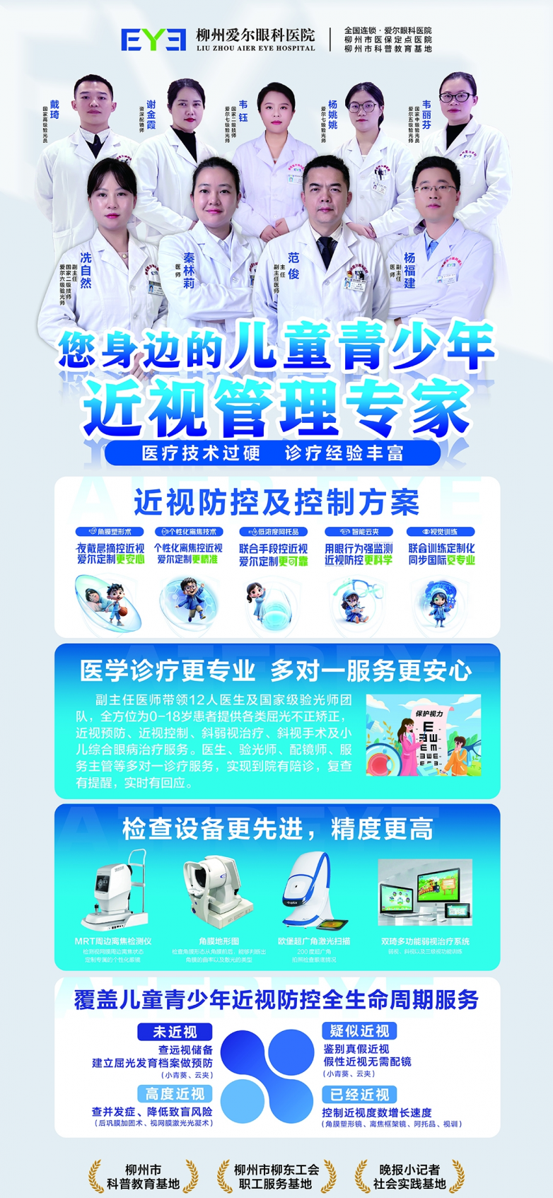 专家强调,角膜塑形镜与低浓度阿托品是目前国际公认的青少年近视防控核心手段,并非“二选一”。柳州爱尔眼科依托专业检查与全程随访,为不同孩子、不同眼别定制差异化方案,通过光学干预+药物干预+视功能管理,有效延缓眼轴增长,控制近视加深。